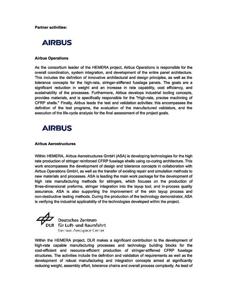 The joint project HEMERA, funded by the German Federal Ministry for Economic Affairs and Energy within the framework of the Aviation Research Program LuFo VII-1, aims at the development and validation of high-rate CFRP manufacturing processes for large, single-curved, and stringer-stiffened fuselage panels. The focus is on the prototypical manufacturing of these panels from thermoset CFRP. The overarching goal is to make fiber composite materials accessible for future high-rate production of >70 aircraft per month while achieving significant weight reduction potential. By the end of the project, the technological maturity of the processes is to be increased and their suitability for series production demonstrated.