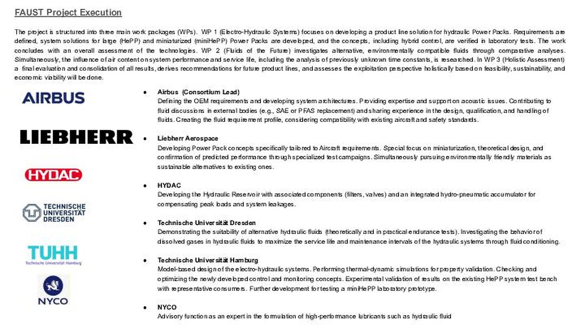 The project aims to significantly reduce the climate impact of the next generation of short- and medium-haul aircraft through innovations in hydraulics. FAUST will develop solutions for component miniaturization to enable their installation in various spaces (e.g. highly swept wings). Central to this is establishing the prerequisites for High-Efficiency Power Packs (HePP), which decouple the generation of hydraulic energy from the engine (eliminating Engine Driven Pumps). This improves engine efficiency and reduces the integration and testing effort for the systems. Additionally, environmentally harmful materials will be replaced. A new, more environmentally friendly hydraulic fluid will be investigated, and alternatives to lead-containing alloys will be developed to comply with future regulations. All measures contribute to a more sustainable aviation sector.